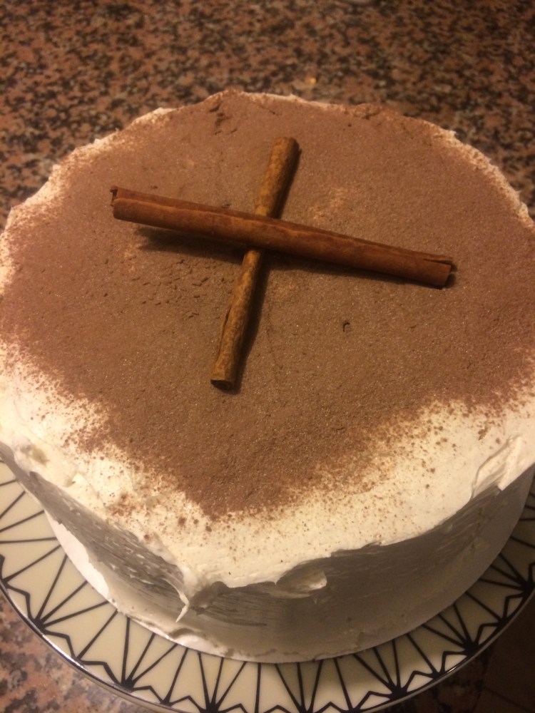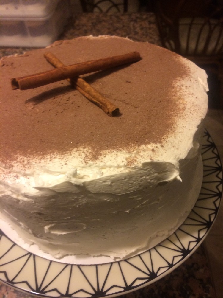 In another small bowl, mix the vanilla, Cinnabon liqueur into the milk and set this aside as well. Bring the water to a boil and pour over the hot cocoa and whisk it until it is smooth. To the egg mixture, alternately add the flour mixture and the milk mixture beginning and ending with flour. With the mixer off, scrape down the sides of the bowl after each addition. With the mixture at a low speed add the cocoa. Scrape down the sides of the bowl and pour this mixture into the prepared cake pans. Bake the cake for approximately 15-20 minutes or until tester comes out clean. When cake layers have cooled, remove from pans and refrigerate until cold.