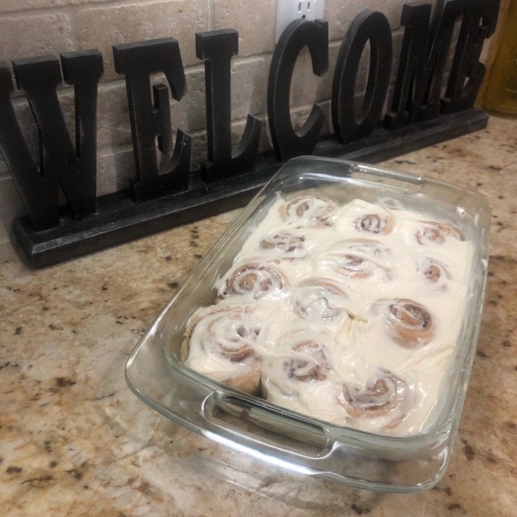Meanwhile, in a medium sized bowl mix together cream cheese, butter, powdered sugar, salt and vanilla. Add milk 1 tablespoon at a time until the frosting reaches desired consistency. Spread over slightly cooled rolls.