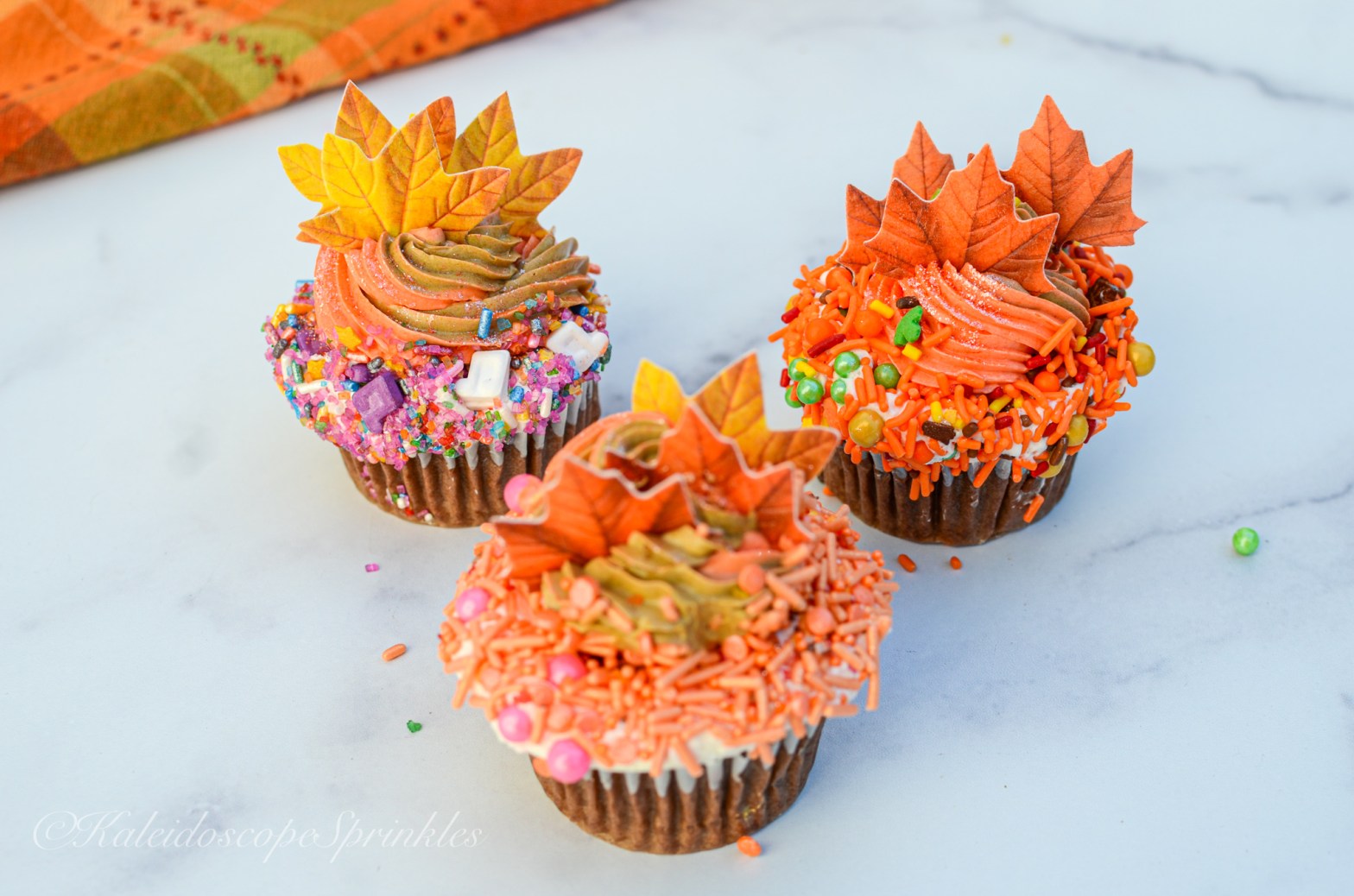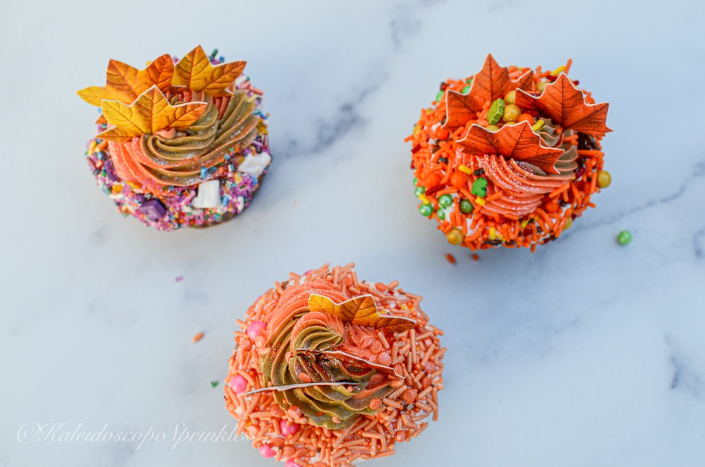 Happy Sunday and National Chocolate Cupcake Day! I’m not sure who decided to make up these official food holidays but my tastebuds appreciate every bit of it. I’m so glad this holiday takes place during my favorite season. I thought that this was the best time to perfect my chocolate cupcake recipe and decorate with Fall decorations to my hearts content. I got my hands on some edible leaves. I, of course, also used the Fall Sprinkle Mix pack and Cosmic Shimmers from my company Kaleidoscope Sprinkles and got to work.