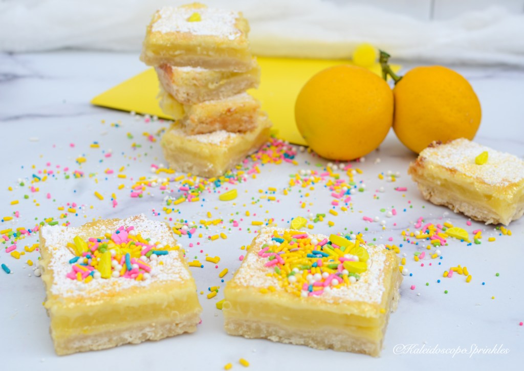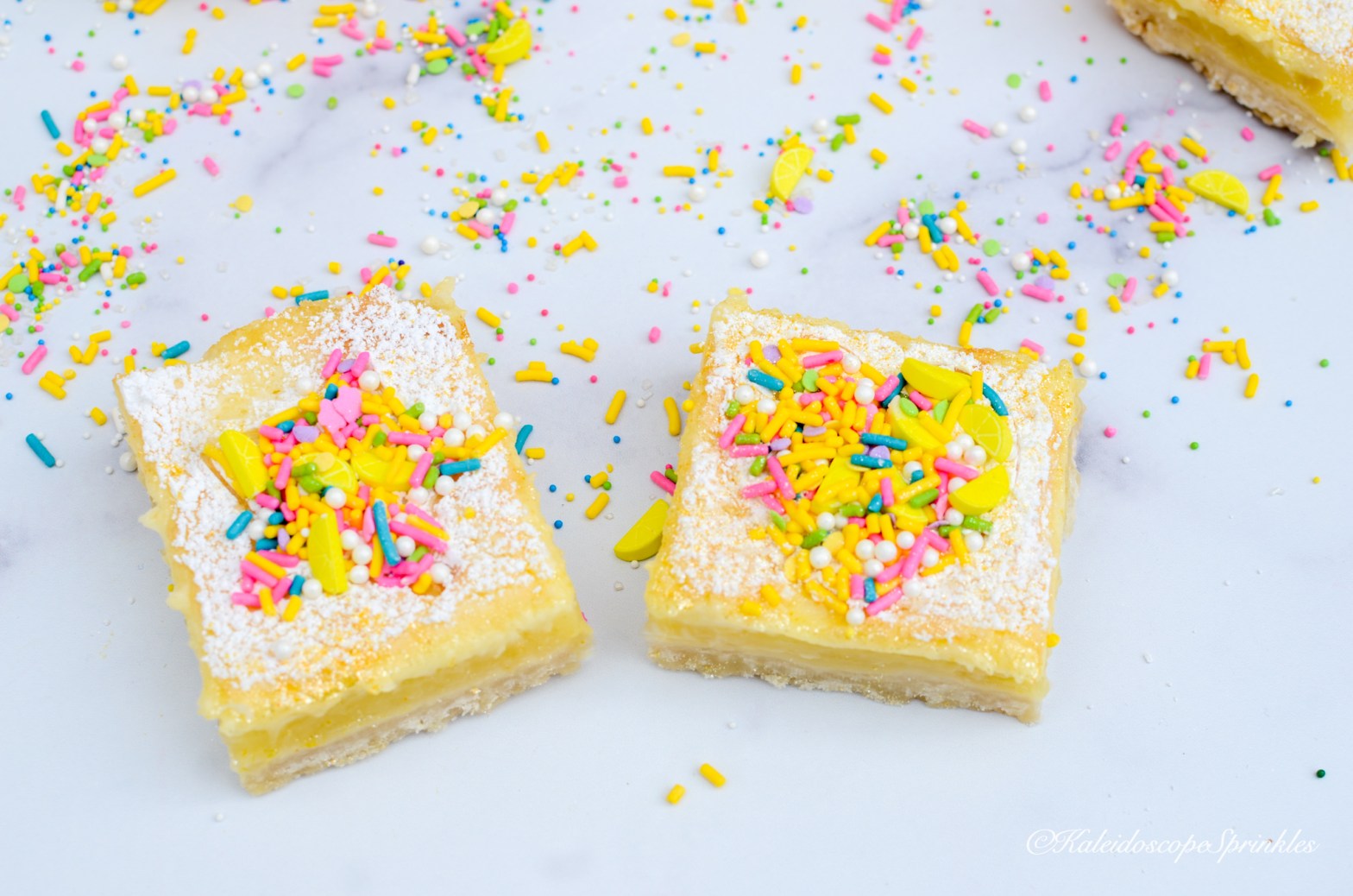 Reduced oven temperature to 325F and bake bars for 25-30 minutes until the filling is set and the edges are slightly golden brown. Let bars cool slightly on a wire rack. Lift out bars from the glass dish and let them cool completely before cutting into 2 inch squares. Dust with confectioners’ sugar. Cover with Lemonade Sprinkle Mix, optional.