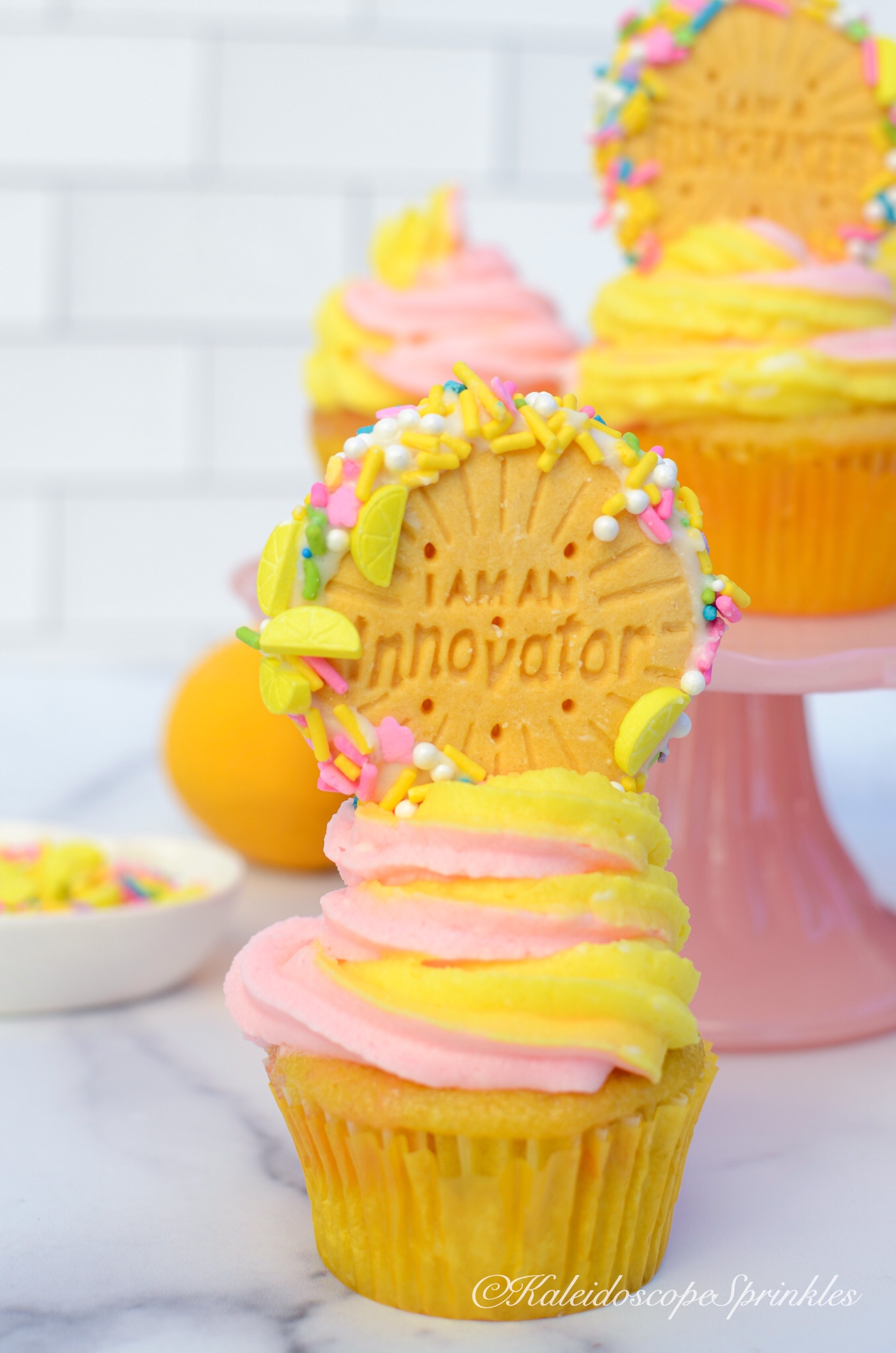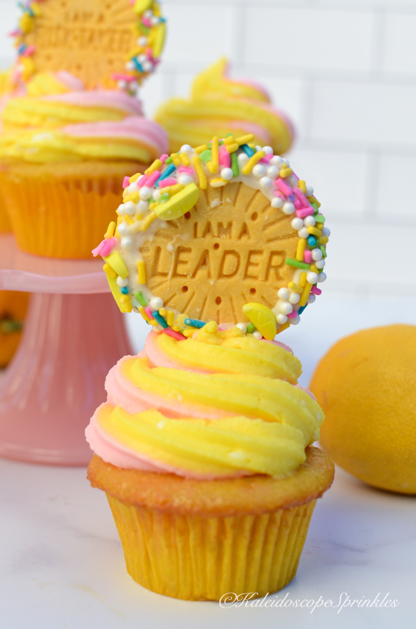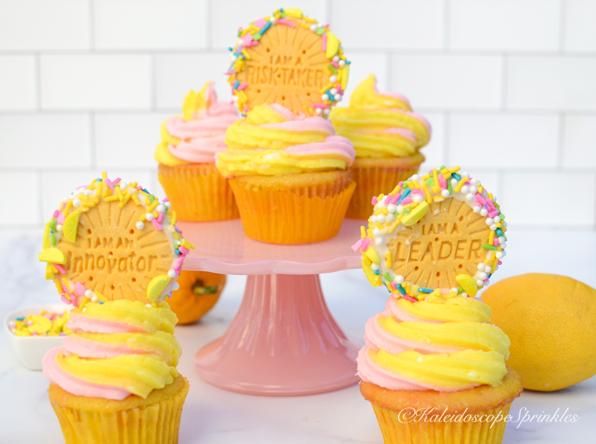 Frost cupcakes with cream cheese frosting. Top with Lemonade Sprinkle Mix and lemon flavored cookies.