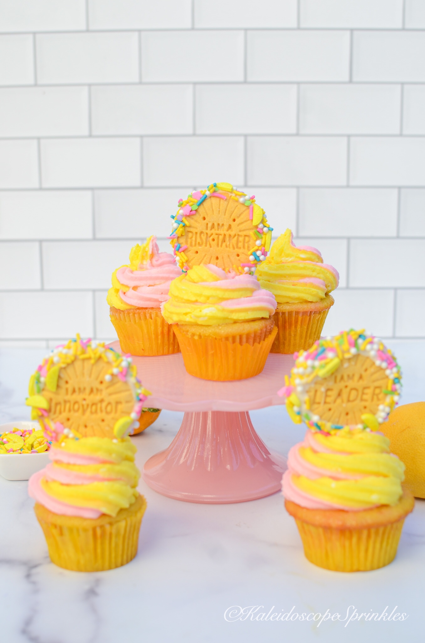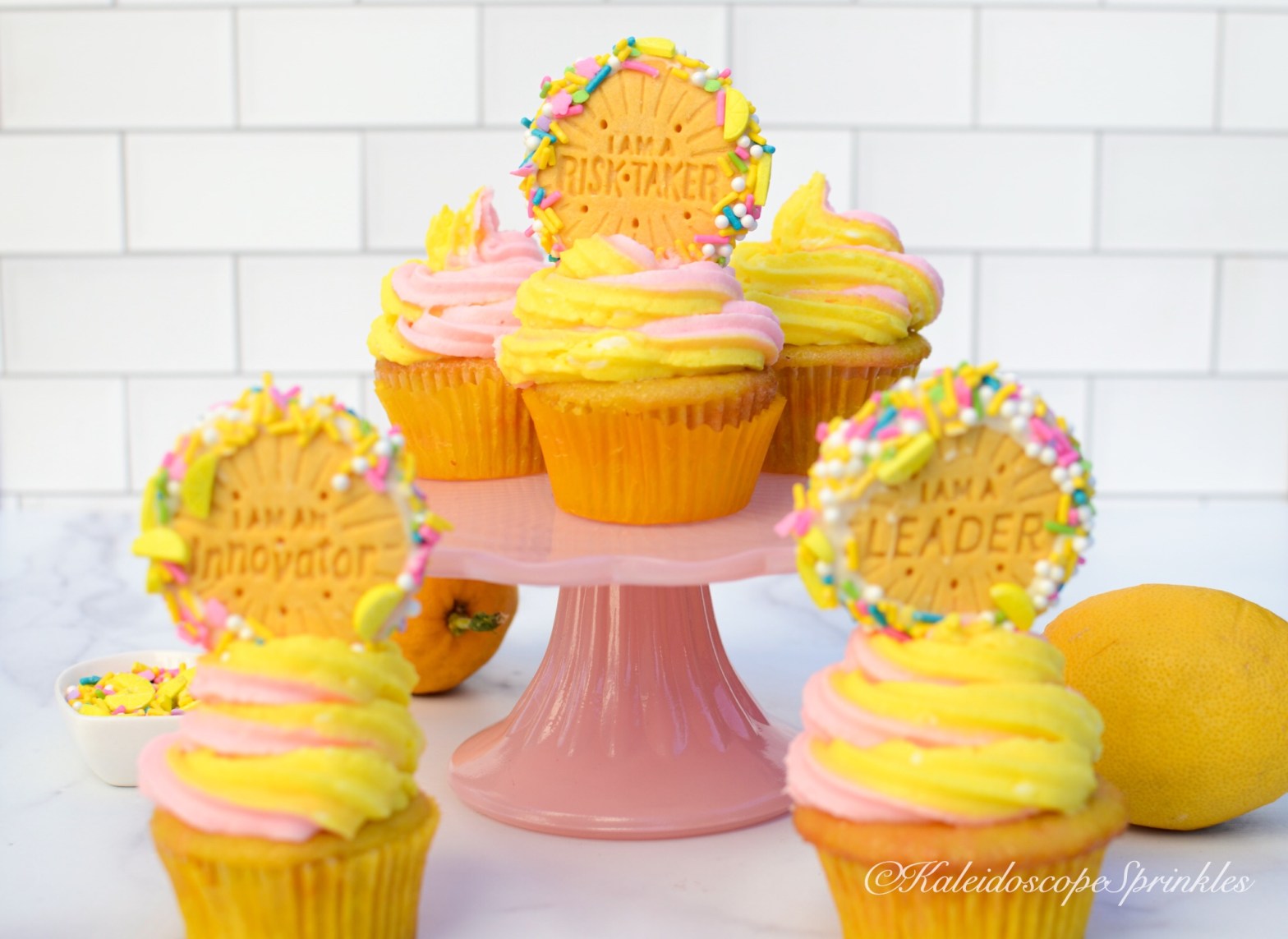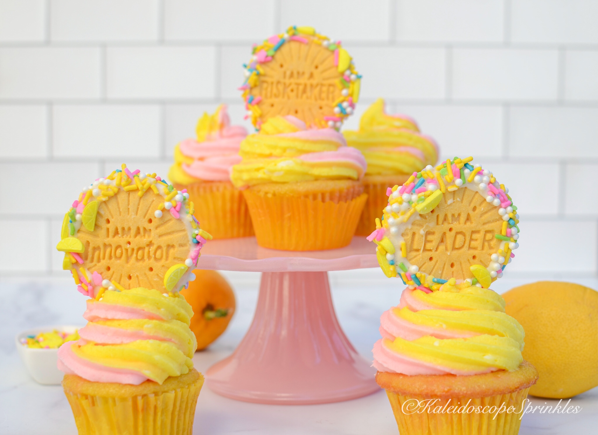 Frost cupcakes with cream cheese frosting. Top with Lemonade Sprinkle Mix and lemon flavored cookies.