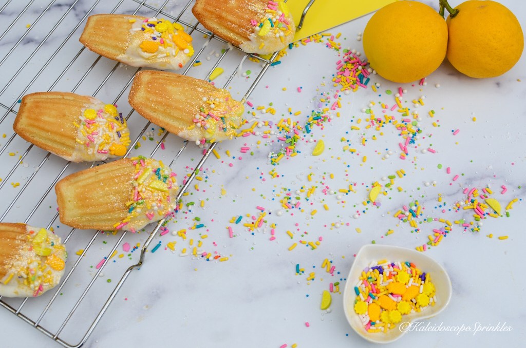 These madeleines are soft, delicate and lemony with a delicious white chocolate almond surprise in the center. I then went even further to dip these cookies in white chocolate for even more sin and sugar. I decided to decorate them with Kaleidoscope Sprinkle’s Cosmic Shimmers, Lemonade and Pineapple Skies Sprinkle Mixes for more color and pizazz.