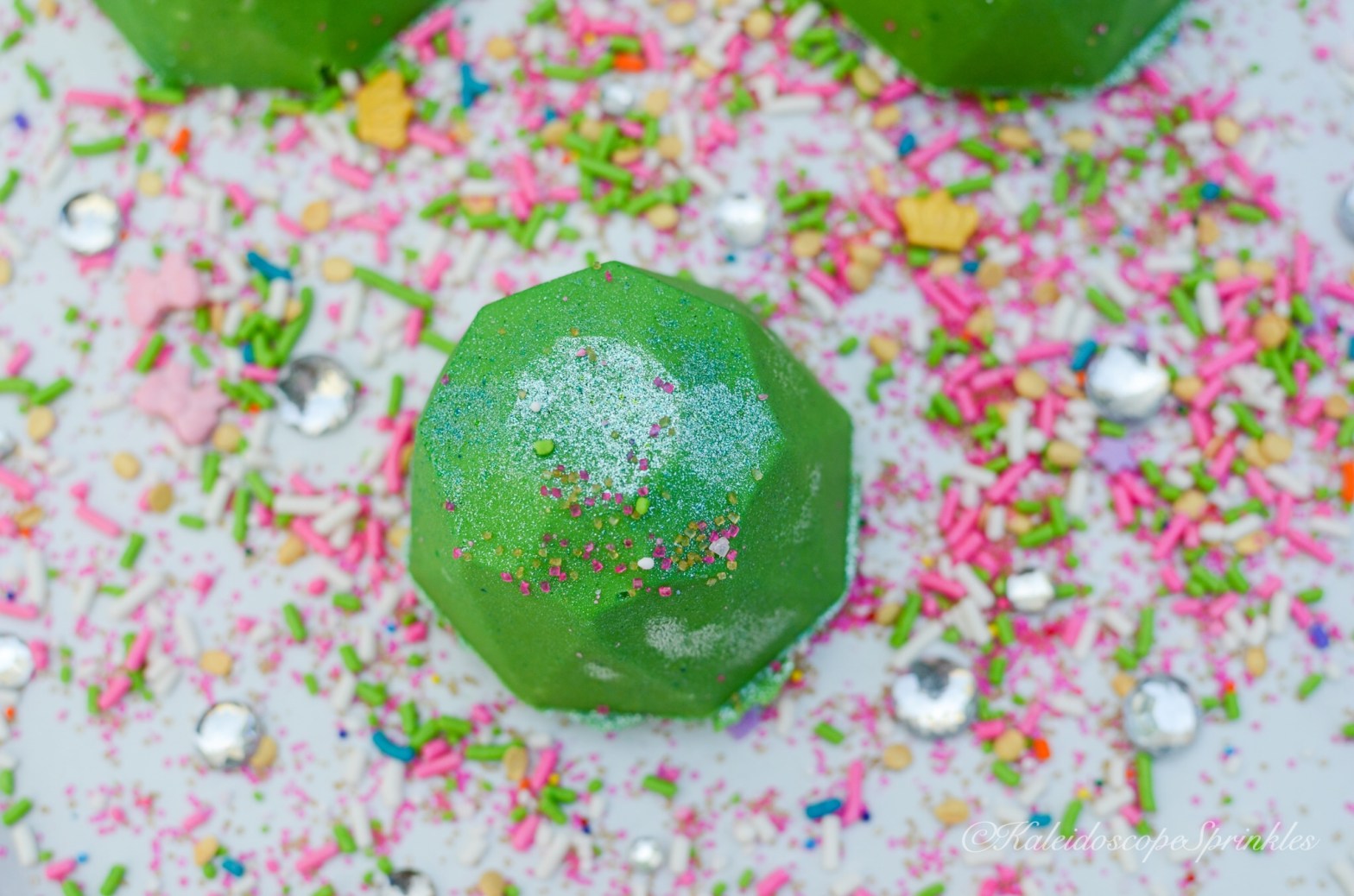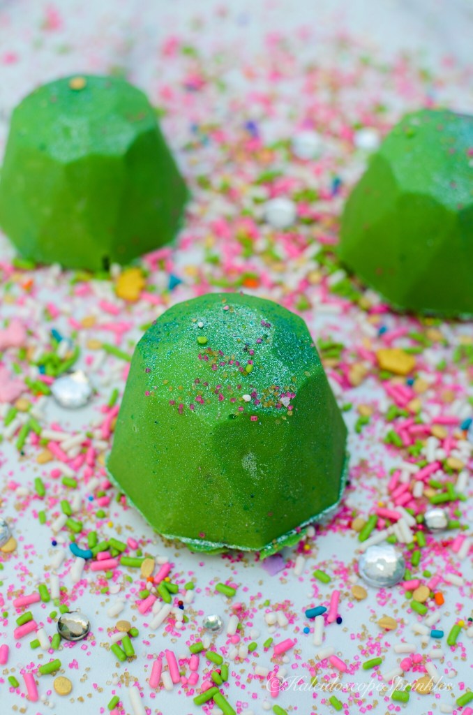For those of you who don’t know emerald is the birthstone for this month. A few months ago I bought a new silicone mold having no clue what I planned to do with it. As usual, the idea came to me during my sleep one night. I woke up, wrote down my idea on my bedside notepad and went back to sleep. I thought I would create my own emeralds for my birthday celebration since I never received one before and could make them delicious. I gathered my ideas and materials and got to work. My emeralds birthday gemstones would be a celebration of May on the inside and out. The insides of these treats are filled with birthday cake flavor and covered in shimmery Kaleidoscope Sprinkles Cosmic Shimmers to make these gems truly shine!