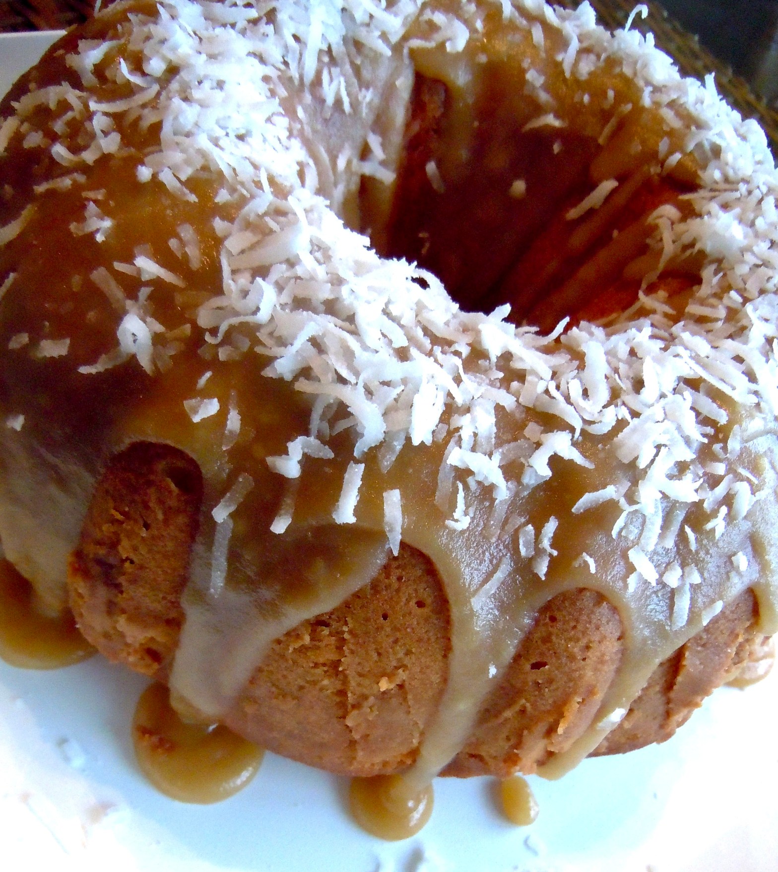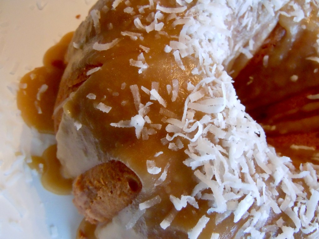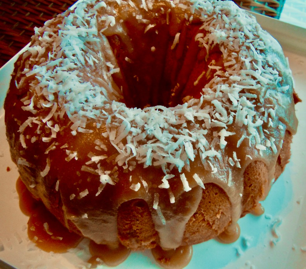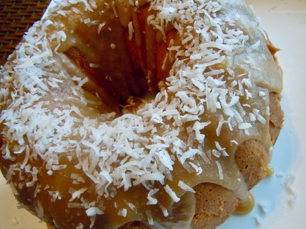 For Glaze: Stir all ingredients together, except confectioners sugar, in a small saucepan over medium-heat heat until brown sugar dissolves and mixture comes to a boil. Reduce heat to low and add confectioners sugar. Whisk until glaze is smooth, about one minute. Remove from heat. Allow glaze to cool to room temperature. Pour glaze onto cooled cake. Top with shredded coconut.