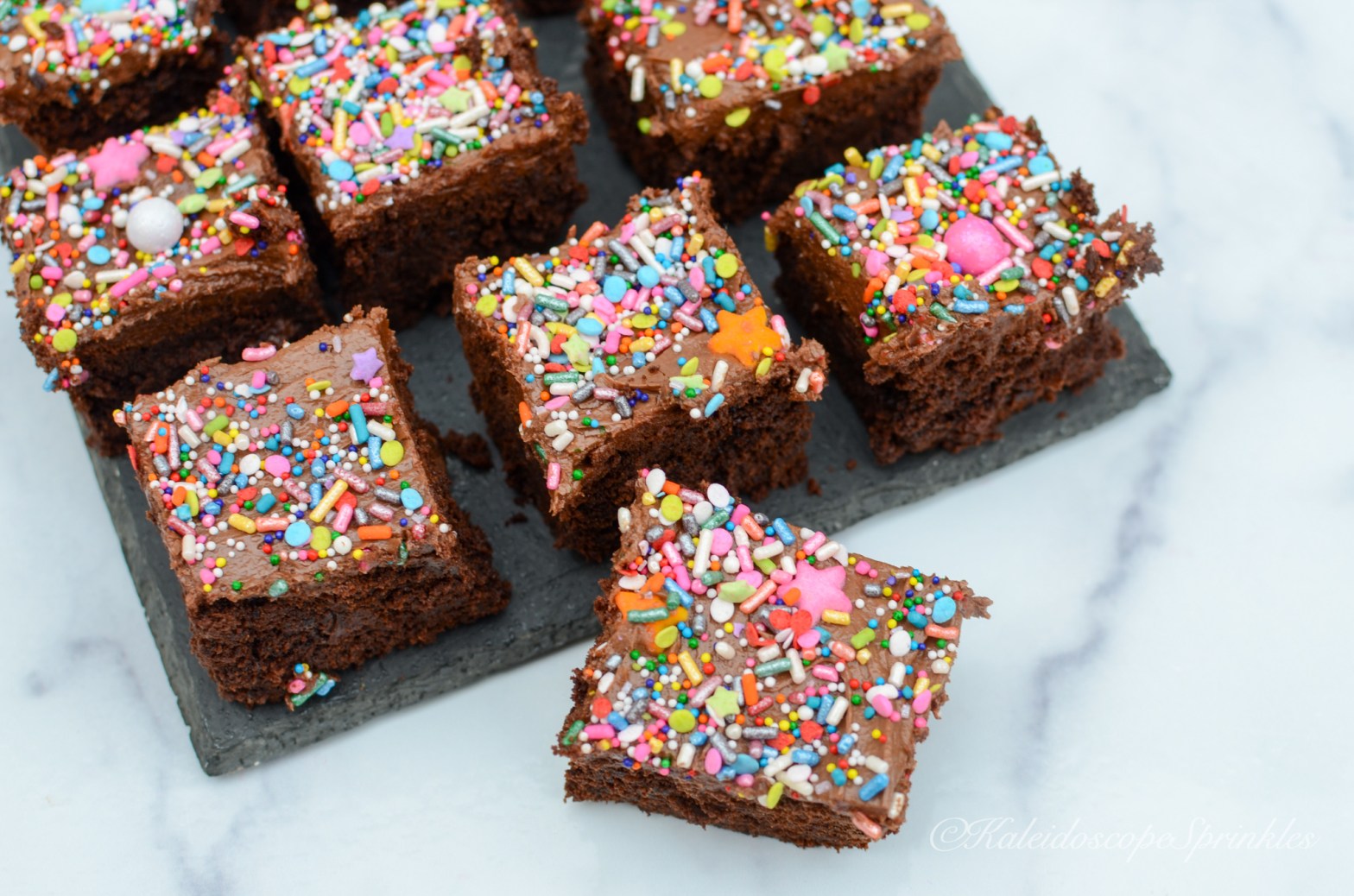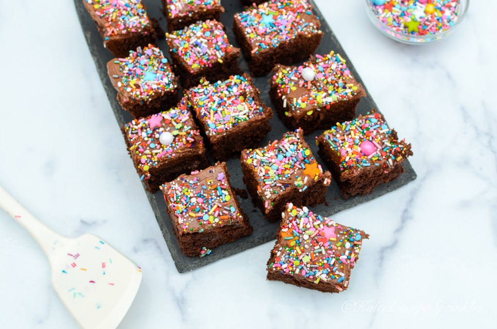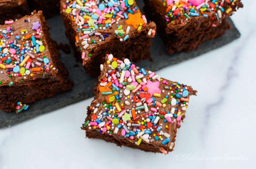 Check out the recipe below for Cosmic Kaleidoscope Brownies. They take those packaged colored delicacies from your childhood to the next step. They are of course made with Kaleidoscope Dreams Sprinkle Mix, tons of rich, delicious chocolate and love.