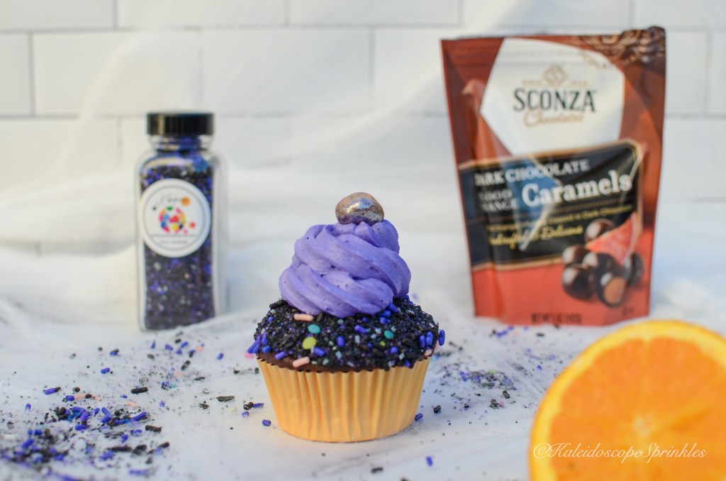 This year I’m not dressing up because honestly Halloween came too fast and I wasn’t prepared. Since I’m not dressing up in a costume I thought I would be fancy and dress up some cupcakes. These cupcakes are definitely not kid friendly and are made for those adults who still want to partake in the celebration. These fabulous chocolate stout cupcakes are made with a blood orange hazelnut ganache and a perfect balance of orange Grand Marnier buttercream. What makes these cupcakes even more grown and sexy is the decoration with Kaleidoscope Sprinkles Scary Spice Sprinkle Mix. The cupcakes are then topped with Cosmic Sprinkles covered blood orange dark chocolate caramels from Sconza Chocolates. You can’t get any more amazing than that.