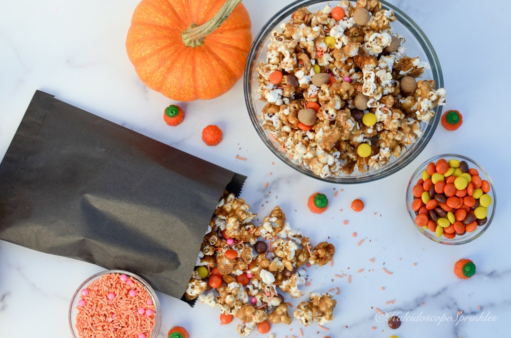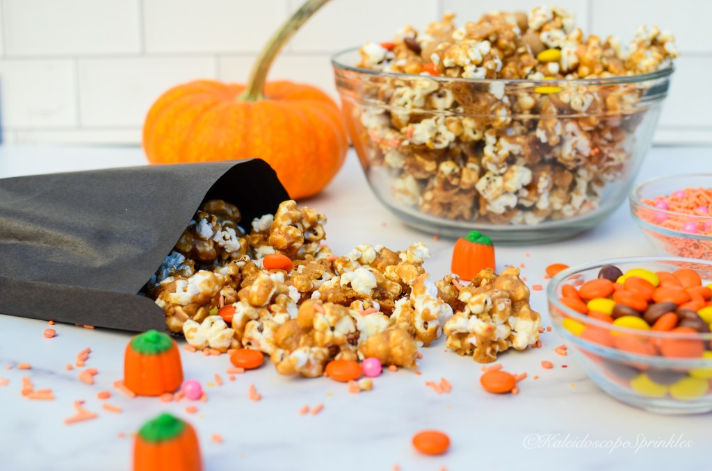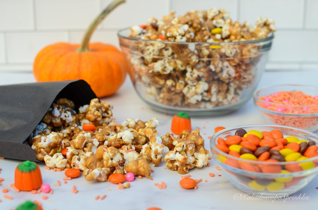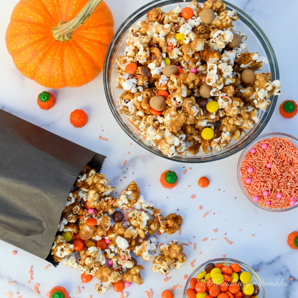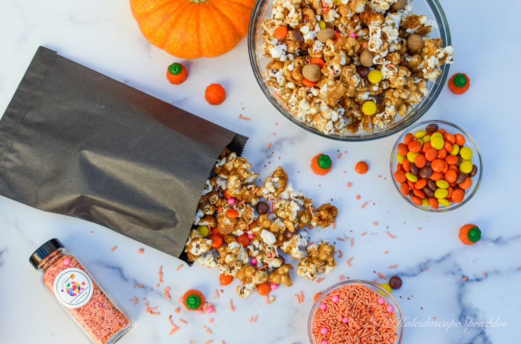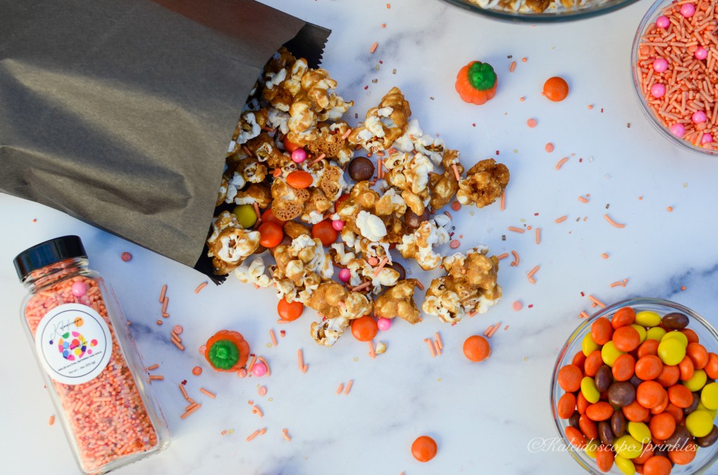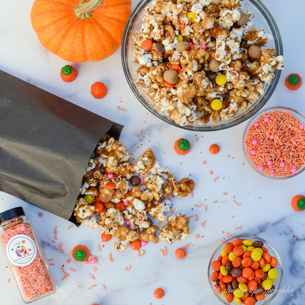 For this season I decided to try my hands at some sweet, delicious caramel corn. I couldn’t just have ordinary caramel corn with my love for everything pumpkin spice. I thought this additional boost of flavor would make the caramel corn even better and was I right. This recipe of caramel corn is honestly some of the best popcorn I’ve tasted. Not only did I add pumpkin spice, but I also added some additional pizzazz with Kaleidoscope Sprinkles Sweet Potato Pie Sprinkle Mix. I also added some of my favorite fall candies like Reese’s Pieces and Sconza Pumpkin Spice Chocolate Caramels.
