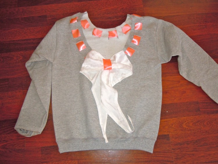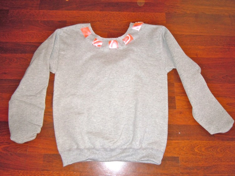 Using your fabric pen and measuring tape, measure out 1.25 inch lines around the entire collar of your sweatshirt. (Make sure to leave about a 0.5 inch space between the collar and your mark). Once all your lines have been marked, cut lines the width of your ribbon on all the places you made marks around the collar. (Once again, make sure your cut lines do NOT intersect with the actual collar point). Once all lines have been cut, take your ribbon and basket weave it through your cut lines. Make sure the beginning and ending of your ribbon are at the apex of your back collar. Take your fabric glue and glue your ribbon in place. Trim off excess ribbon. Turn sweatshirt right side out. Take 3 inches of your excess ribbon and glue the ends together, (this will serve as the middle of your bow). Once ribbon has dried, slide ribbon piece over fabric and place it in the center of the fabric. Glue ribbon piece to the apex of back of the sweatshirt. Fold one side the fabric over, so it resembles a bow. Glue the side of fabric to the back of the sweatshirt. Repeat this on the other side of the piece of fabric. Now glue the hanging fabric pieces by the apex of the collar so that they are able to stay in place but are still free flowing. Allow sweatshirt and glue to dry over night.