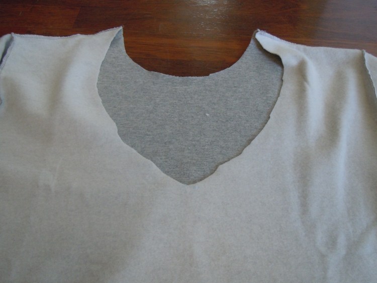 Using your fabric scissors, cut off collar of sweatshirt. Turn sweatshirt inside out. Have back of sweatshirt facing you. Draw horizontal line from armpit to armpit. Measure center of line. Mark center of line. (this will be the apex of your back). Fold your sweatshirt length wise, making sure the center mark is visible and all the seams line up on each side of sweatshirt. Cut from Top arm seam to the apex mark. Unfold your shirt. (You should now have a low v-shaped cut in the back of your sweatshirt.) Clean up the edges, using your scissors, making sure the sides are as symmetrical as they can be. Set aside