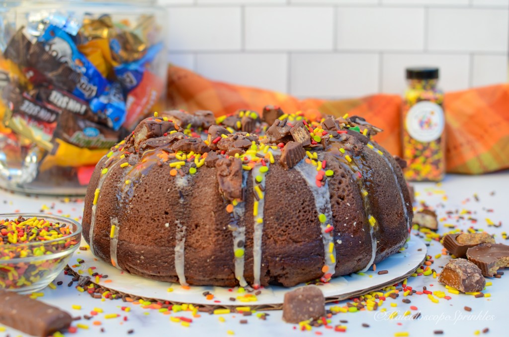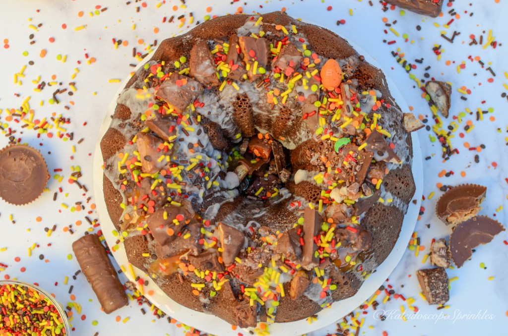 Check out my latest recipe, Chocolate Hangover Cake. This delicious chocolatey recipe is full of yummy candy bar bits and rich cream cheese filling. The cake is then covered with a white chocolate glaze. The cake is then decorate with Kaleidoscope Sprinkles Why Iota Sprinkle Mix and more candy bar bits. This cake is incredibly delectable and decadent. It’s a great way to use up all that let over candy and makes a great gift!