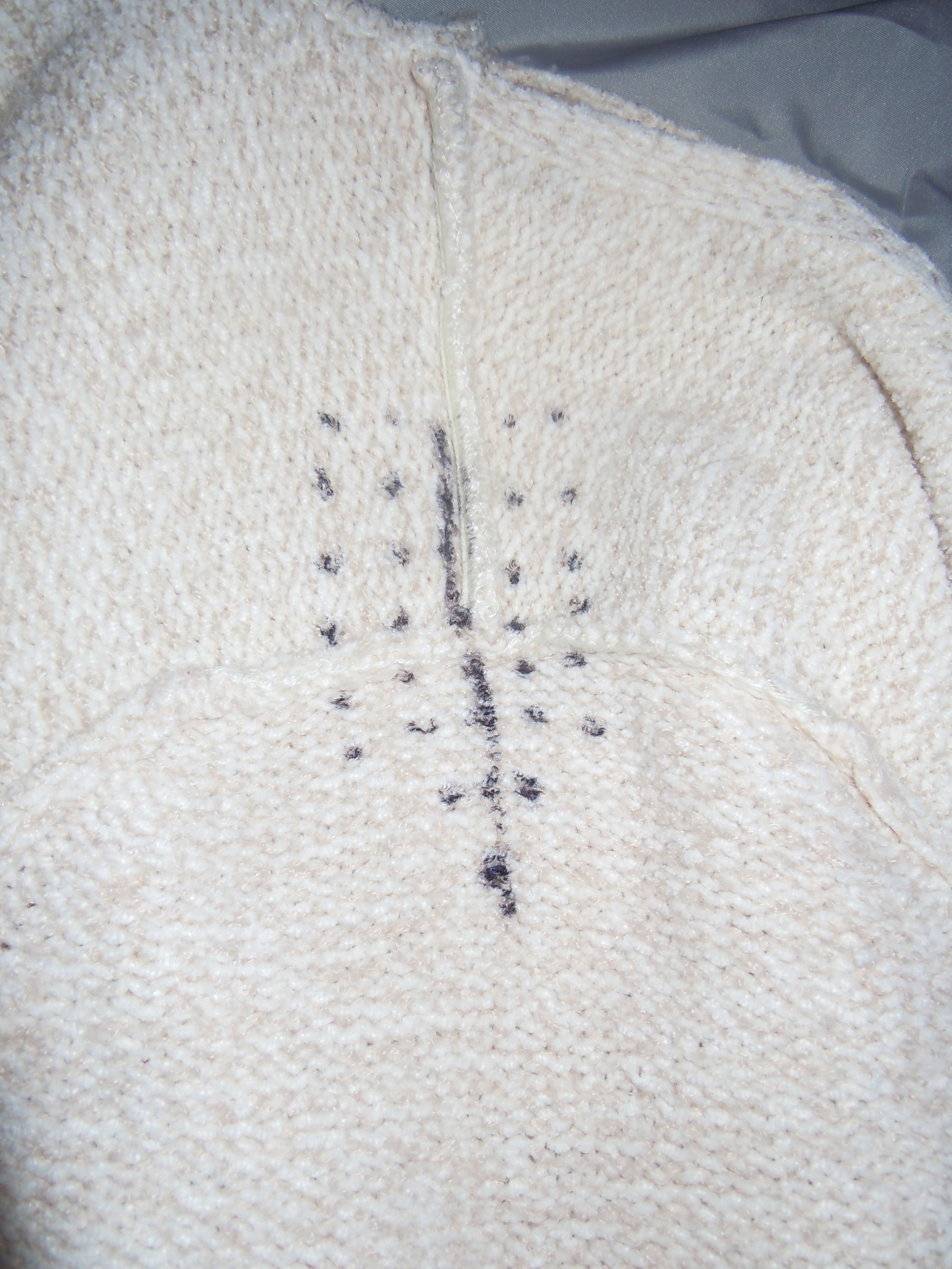 Make sure your sweater is washed and ready. Turn sweater inside out. Try sweater on. Mark on sweater approximately where spikes would sit on center of your shoulder. Take sweater off. Keep sweater inside out. Fold sweater down center so that sleeve is in the center of sweater. Place access fabric or paper between sweater to prevent bleeding of pen through fabric. Take your ruler and your pen, start from shoulder seem trace 2″ vertical line above and below shoulder seem. Starting from top center of vertical line, mark dot approximately 0.5″ apart horizontally. Move down 0.5″ from first row and mark dots again until your reach shoulder seem. Repeat the step twice on vertical line below shoulder seem. On second to last line. Draw two dots, each about 0.5″ away from vertical line. On last line, place mark in center of two dots above. Turn sweater over and repeat marks on the other side of the sweater. Try to keep both shoulder marks as identical as possible.