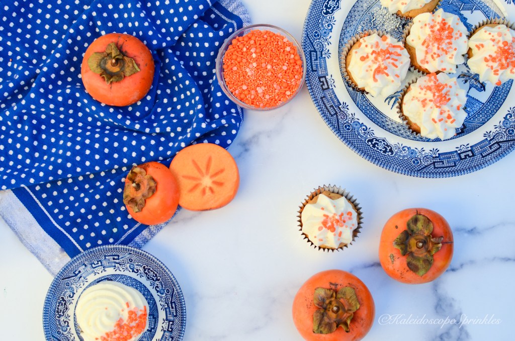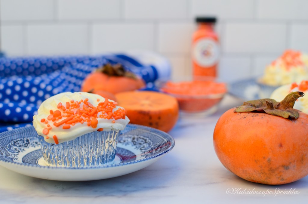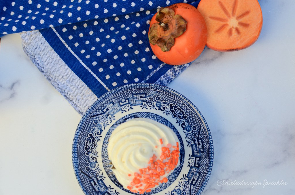 I have used persimmons in the past to make bread or muffins. I know it to be a very mild flavored fruit that needs some background singers to make to really sing. I decided that these permissions would shine with sugar and spice. To add even more pizzazz I made some delicious cream cheese frosting. I then topped the spectacular treats with Kaleidoscope Sprinkles Orange Jevarius Sprinkle Mix.
