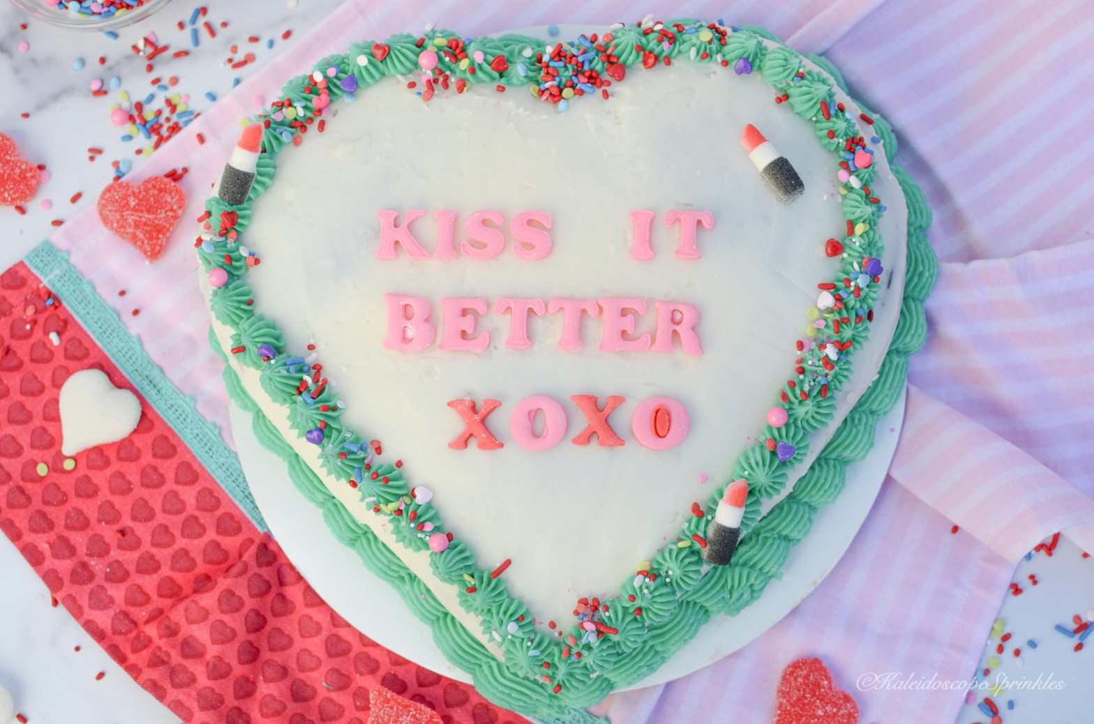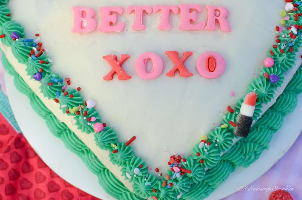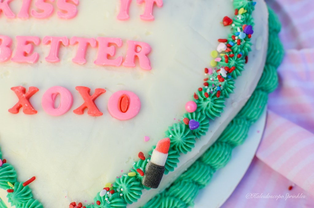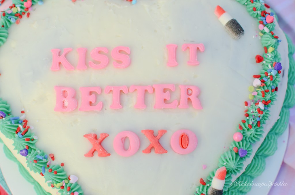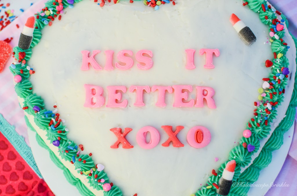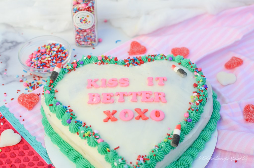 One day while I had this song on repeat, just flowing to the words and chords, I became inspired with a new recipe. The idea of chocolate covered strawberries danced around in my head. I thought how could I take this classic aphrodisiac and make it even more sensual yet scrumptious. I decided to make a rich chocolate cake and fill it with a bright, tangy and sweet creamy strawberry filling. I then thought I would decorate it to my heart’s delight in the shape of the same name. I then covered it with Kaleidoscope Sprinkles Kiss It Better Sprinkle Mix for even more thrills.