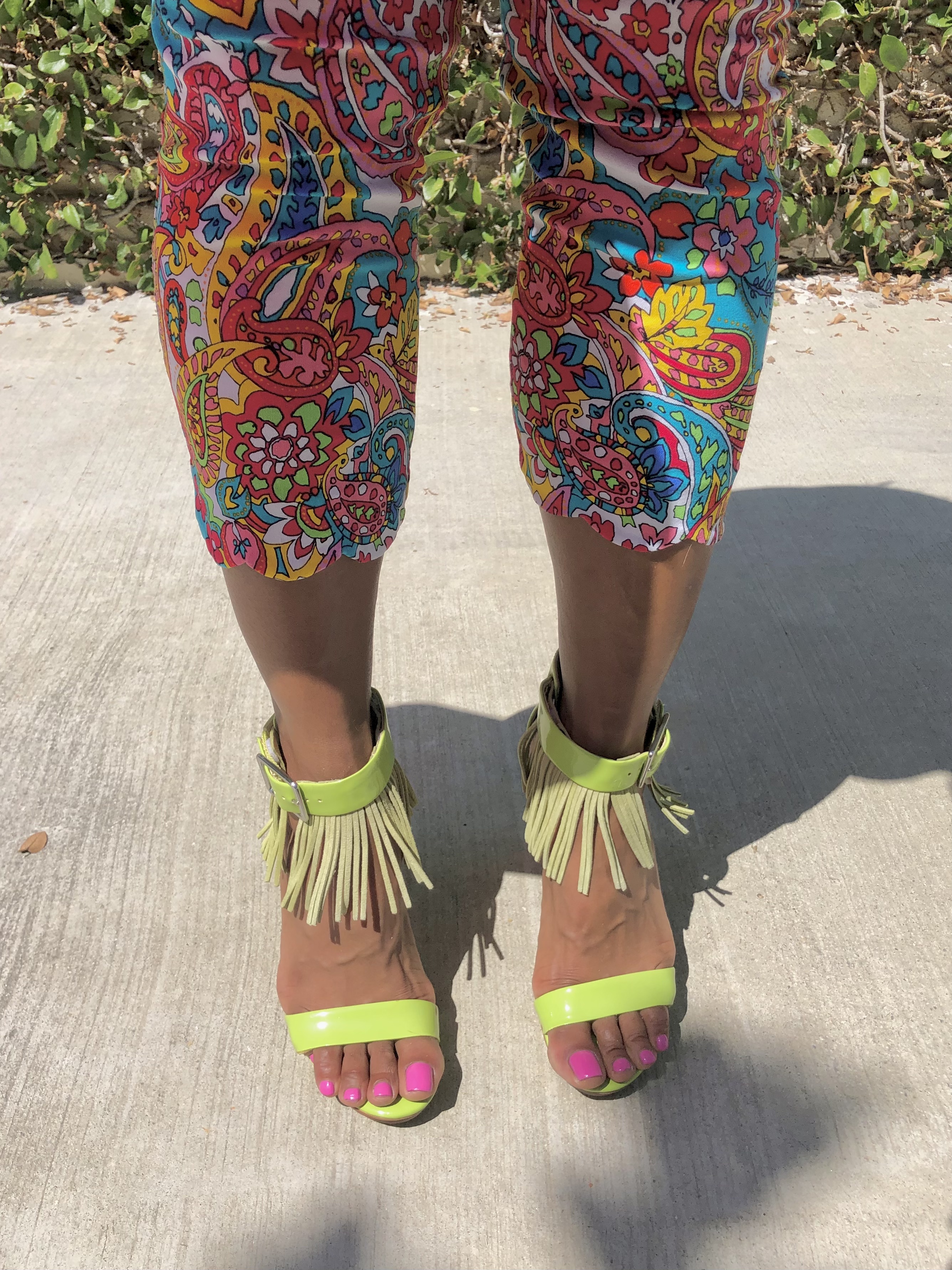 Take your super cute heels and measure the ankle band where you plan to apply the fringe. (Make sure you buy enough fringe to cover the entire area). When measuring, make sure to not measure the area that goes through the buckle (if you have one) since you can not add fringe here. Cut your fringe to match the measurements on each side of the band (buckle and unbuckled side)