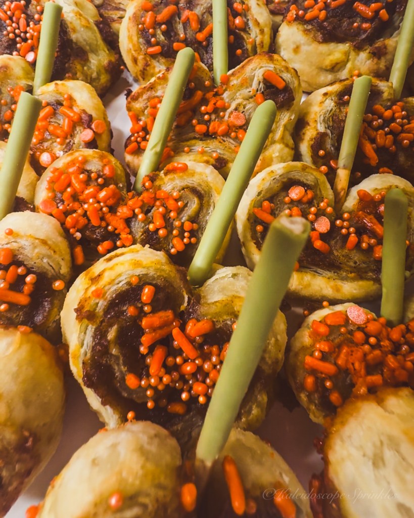 This year, I don’t think I’ll be making it back to Paris, so I thought I’d bring the Parisian food for fall here to me. I got the idea to make some super easy and simple pumpkin spice flavored palmiers. Palmiers are French cookies made of laminated dough. There are other international versions of this cookie in other countries as well. I decided to put my own spin on them by making them full of pumpkin spice flavor. I even decided to decorate them to look like little pumpkins as well using Kaleidoscope Sprinkles.