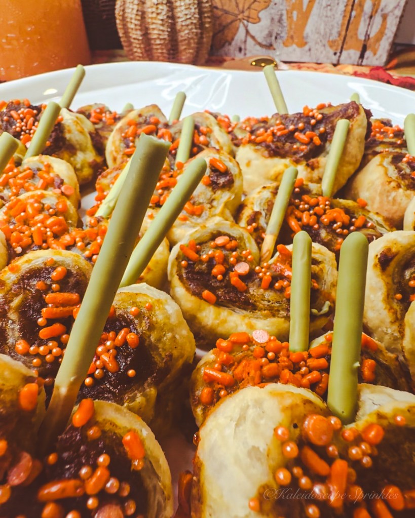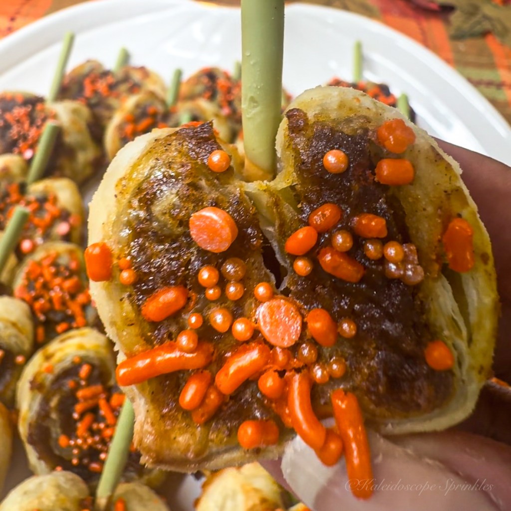 Let cool for 5-10 minutes on the pan on a rack before removing to a serving plate. Place Pocky sticks into palmiers for more pumpkin flare and flavor (optional).