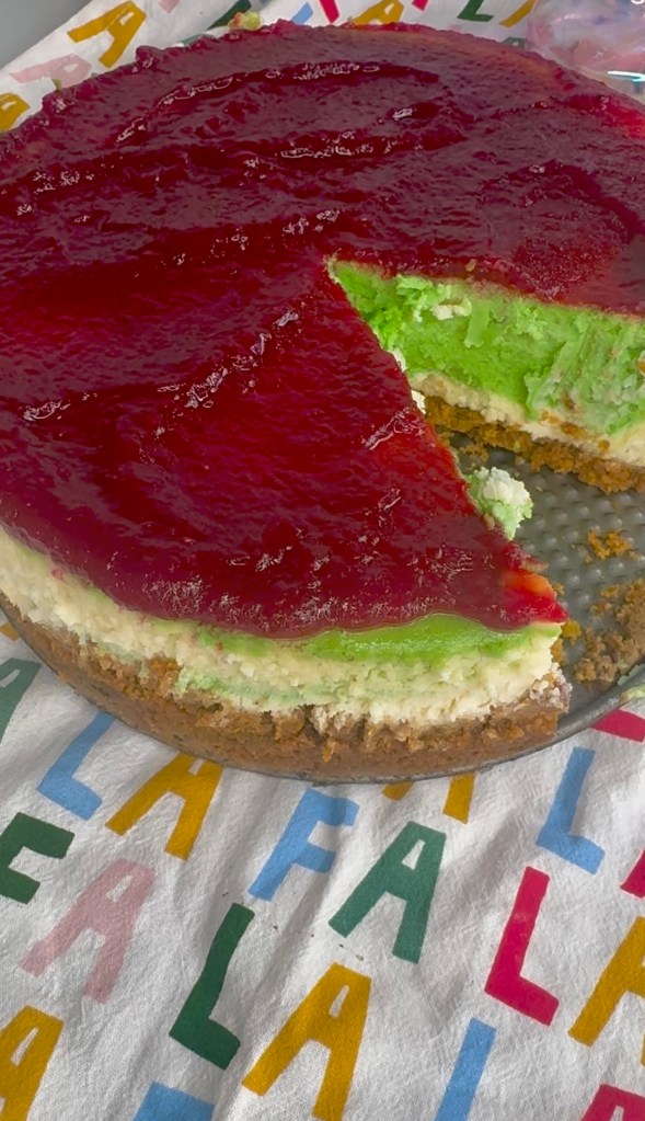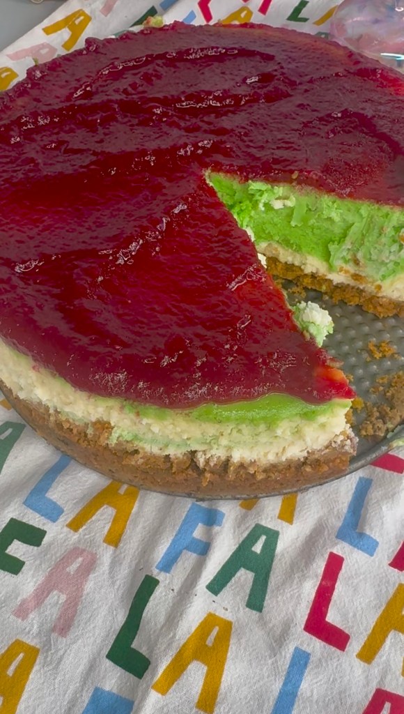 White Chocolate Pistachio Cheesecake with Cranberry Glaze