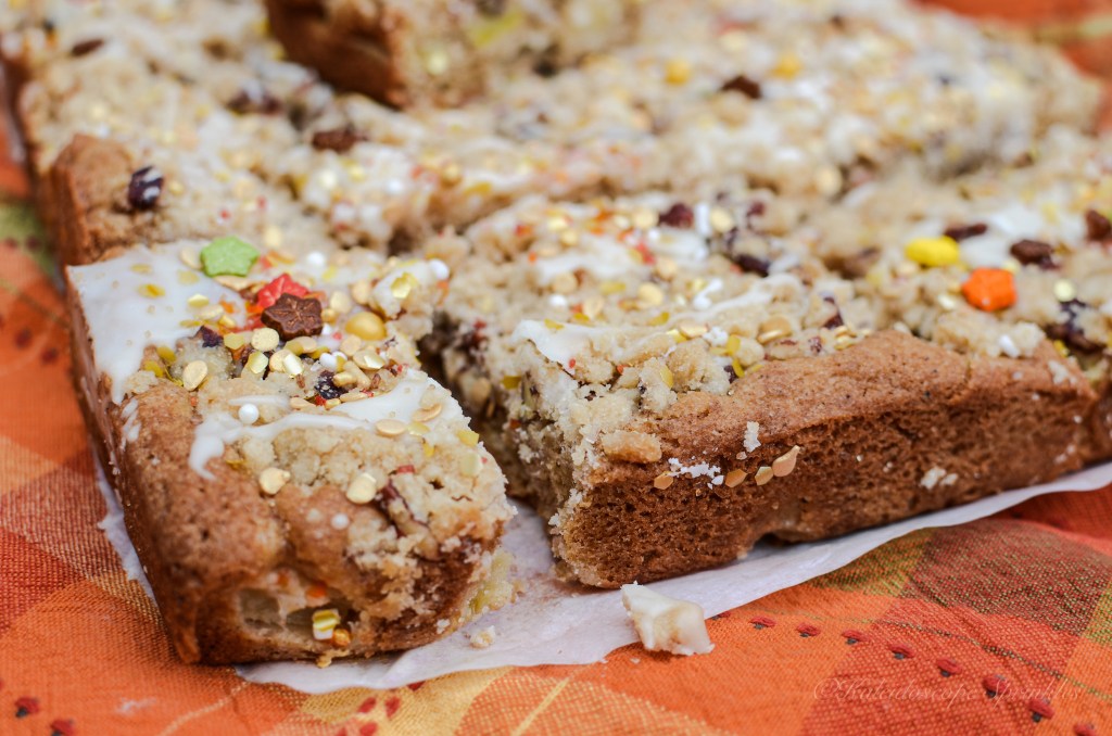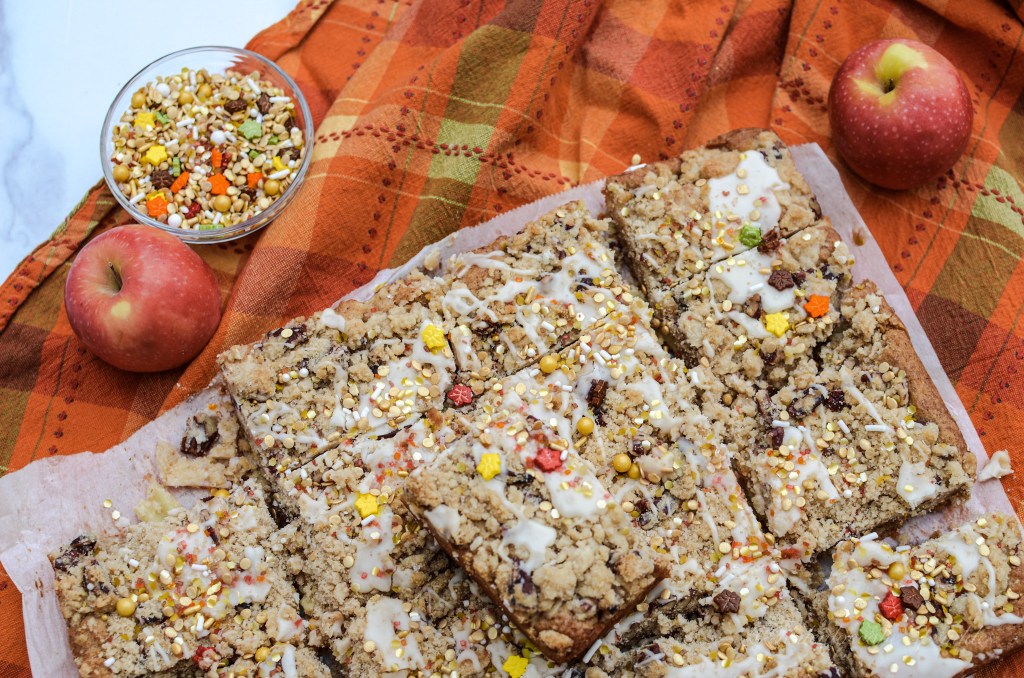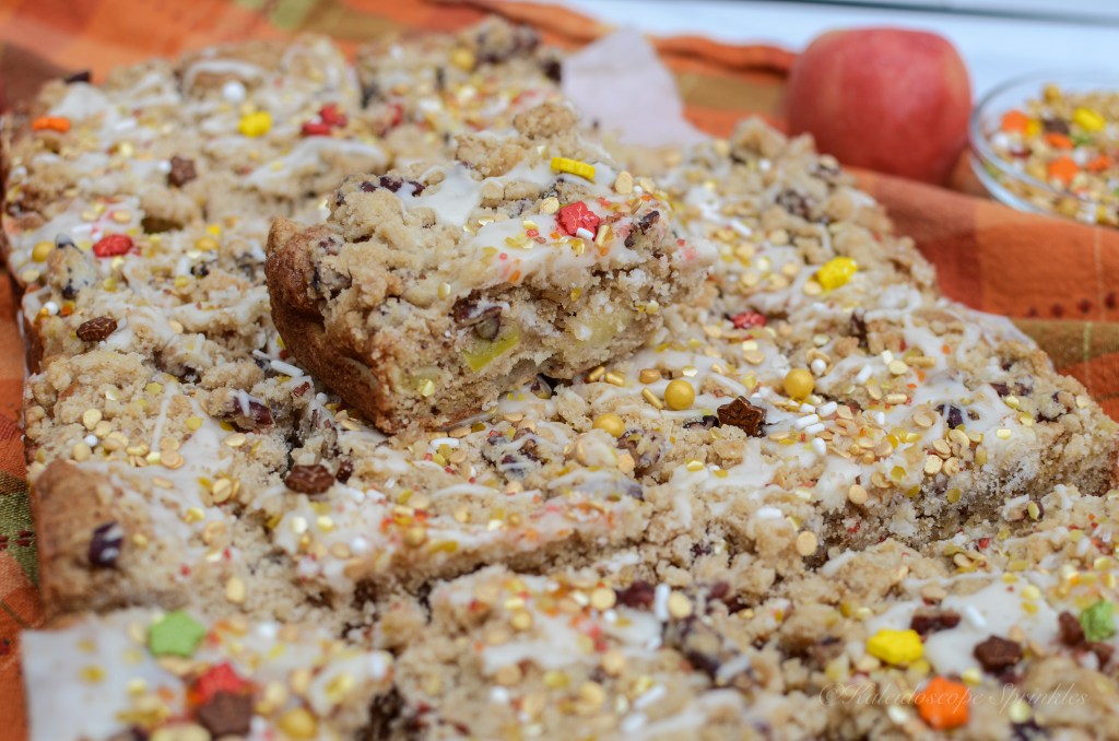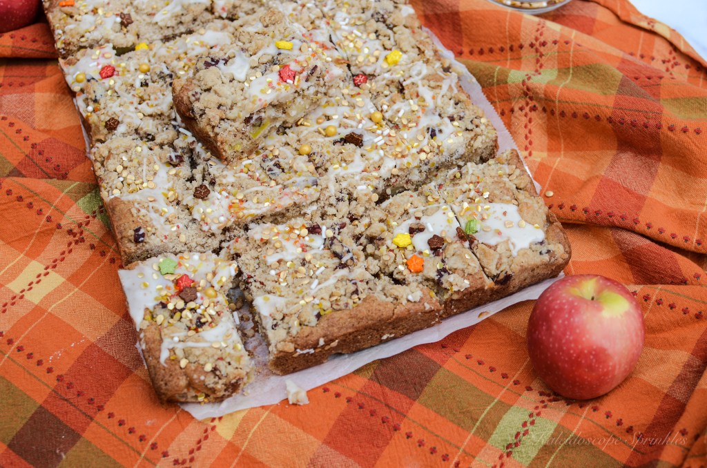 These Brown Butter Apple Pecan Streusel Bars are an excellent representation of the fall flavors that I love. The warmth of the cinnamon and apples with the richness from the brown butter and pecans. I drizzled a maple syrup glaze on top for even more autumn aromatics. I also decided to add even more fall pizzazz with some fall sprinkles to decorate from Kaleidoscope Sprinkles. This recipe is super easy to make and will be a fall favorite for sure.
