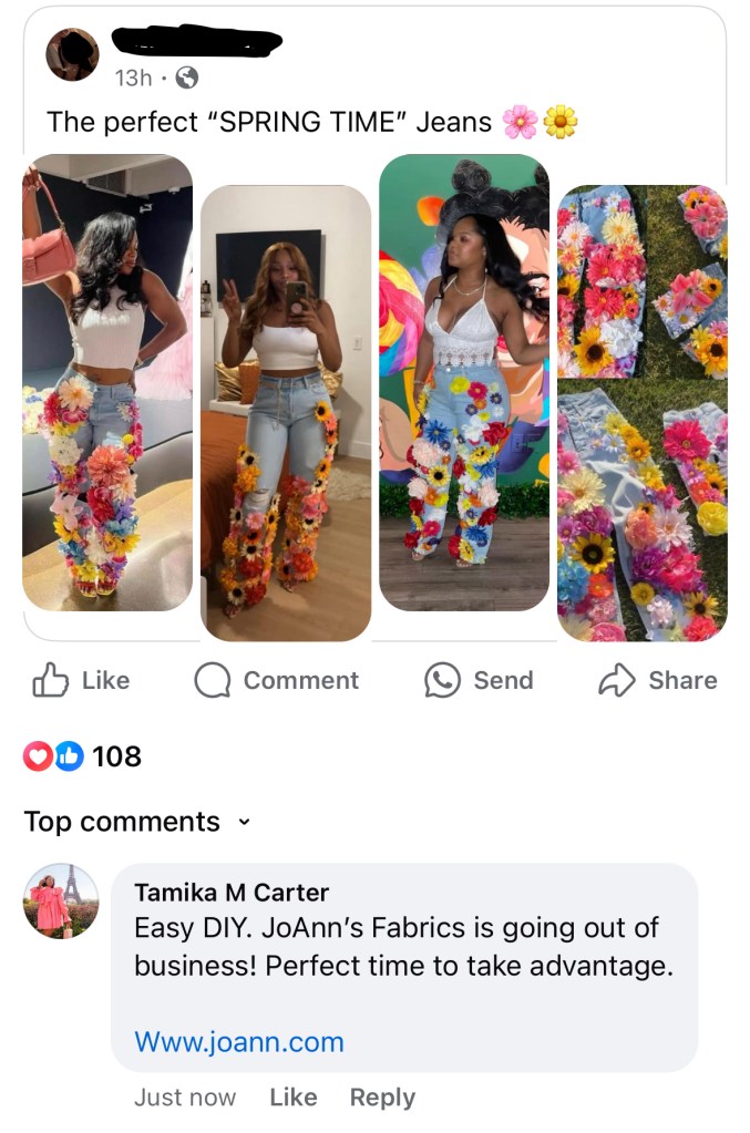 They say “April showers bring May flowers,” but if the flowers are faux then you can have flowers year round. Earlier this year, I was on social media in one of my fashion groups and stumbled upon this super cute photo of some up-cycled jeans. In the picture, the jeans appeared to have sprouted gorgeous flowers from the legs filled with different varieties of flowers. Being the DIY fashionista that I am, I was instantly inspired and ready for my own personalized floral frock.