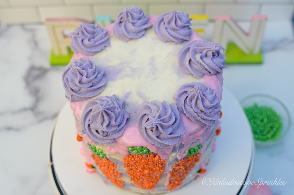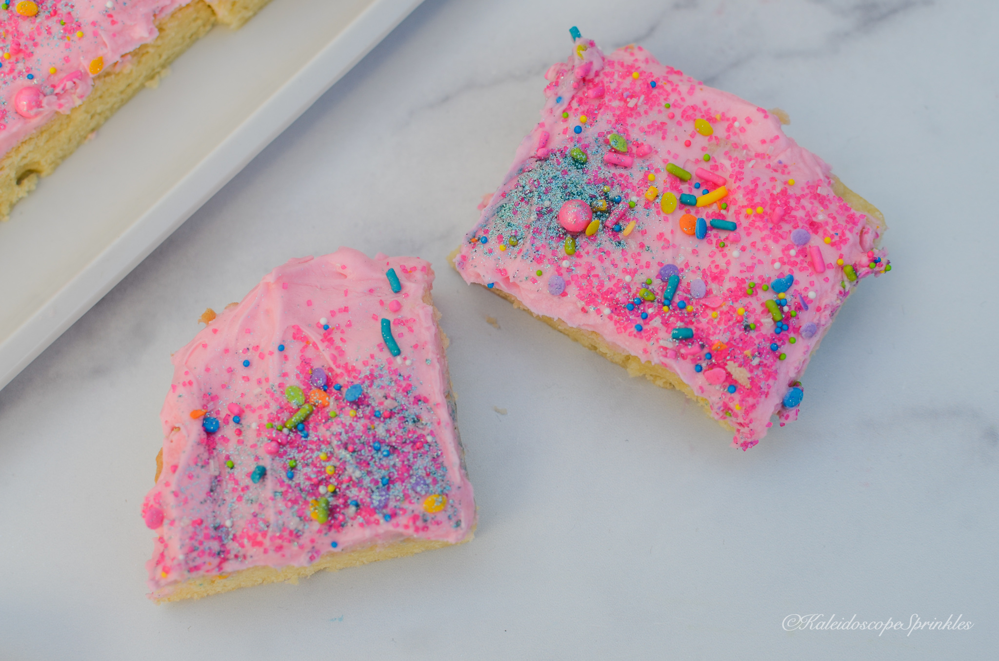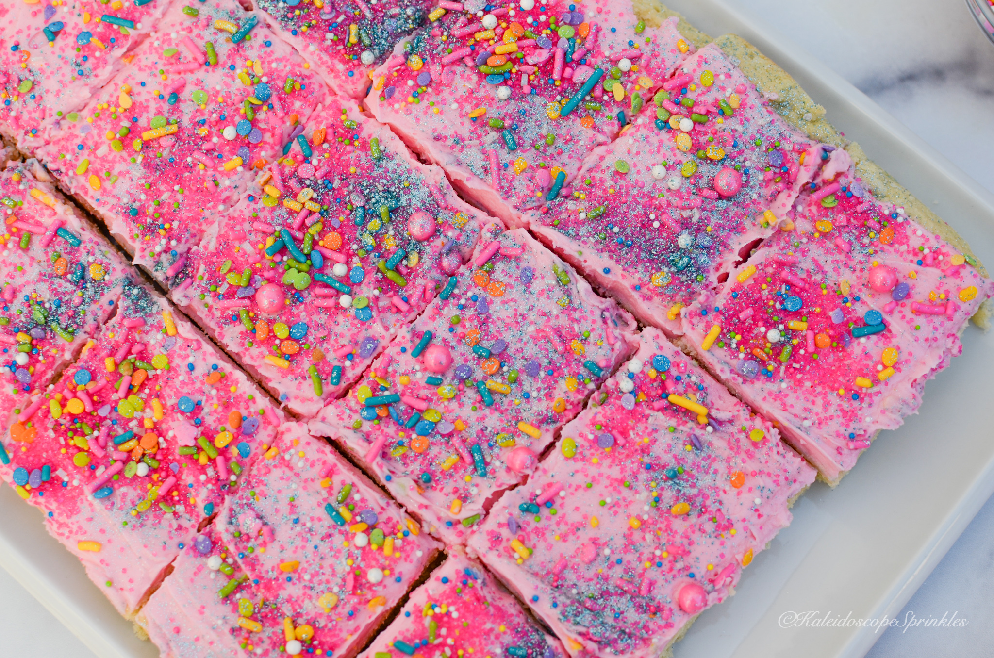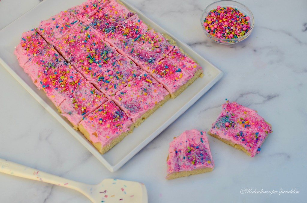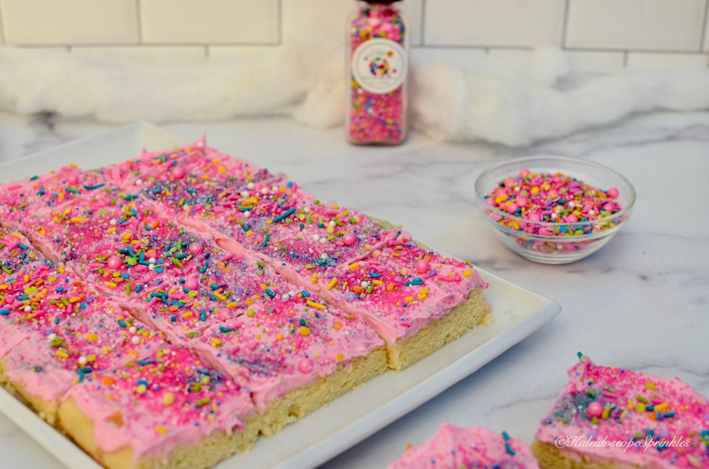 Now you’re probably thinking, “geez it sounds like she has spent a lot of time thinking about sugar cookies!” Guess what? You’re right! I have spent many of nights mastering the perfect sugar cookie recipe. What I have come to find out is in order to get the right textured cookie, it’s better to make bars. I figure now is the right time to share this recipe with you being National Sugar Cookie Day and all. This recipe is amazingly tender with the correct amount of one-of-a-kind flavored frosting. What makes these cookies so incredibly soft and tender are my secret ingredients, almond and tapioca flour. What makes these cookies even more special is they are decorated using Kaleidoscope Sprinkles Neon Gumbo Sprinkle Mix and Cosmic Shimmers. You’ll definitely want to save this recipe and give it a try. Once you do you’ll be an even bigger fan of sugar cookies, promise!
